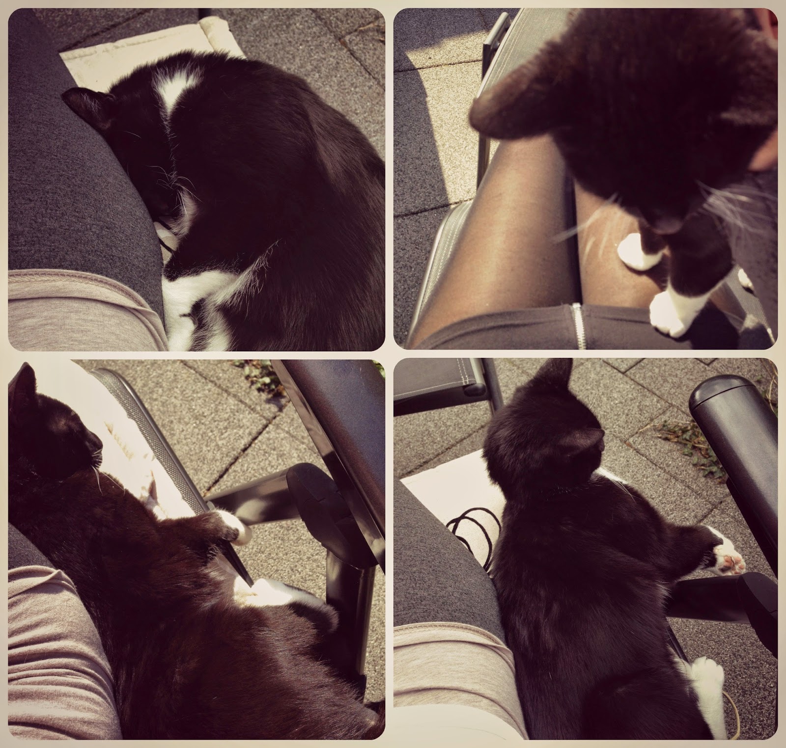 Wij hebben zelf thuis geen kat meer maar ik blijf er gek op, dus ik vind het heerlijk als ik met andermans katten (van mijn vriend, zus of zelfs mijn buren) kan knuffelen. Ik zat een tijdje terug lekker in het zonnetje in de tuin toen de kat van de buren naar me toe kwam wandelen. Na wat aaien vond 'ie het wel zo gezellig zich gewoon naast me te nestelen, ook al past het eigenlijk niet. Gezellig!